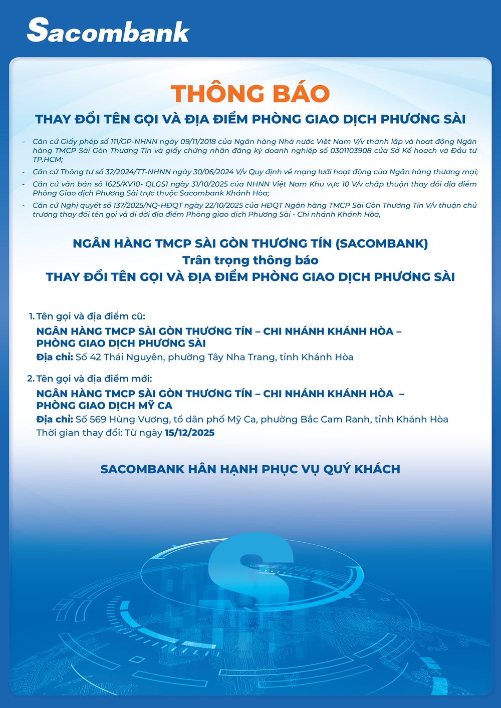 Sacombank trân trọng thông báo đến Quý Khách hàng về việc thay đổi tên gọi, địa điểm Phòng giao dịch Phương Sài.
