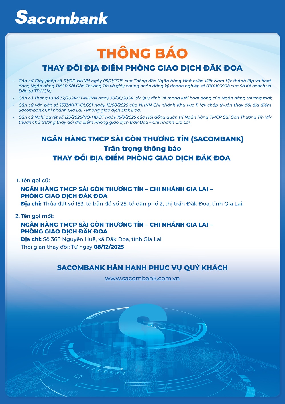Sacombank trân trọng thông báo đến Quý Khách hàng về việc thay đổi địa điểm Phòng giao dịch Đăk Đoa.