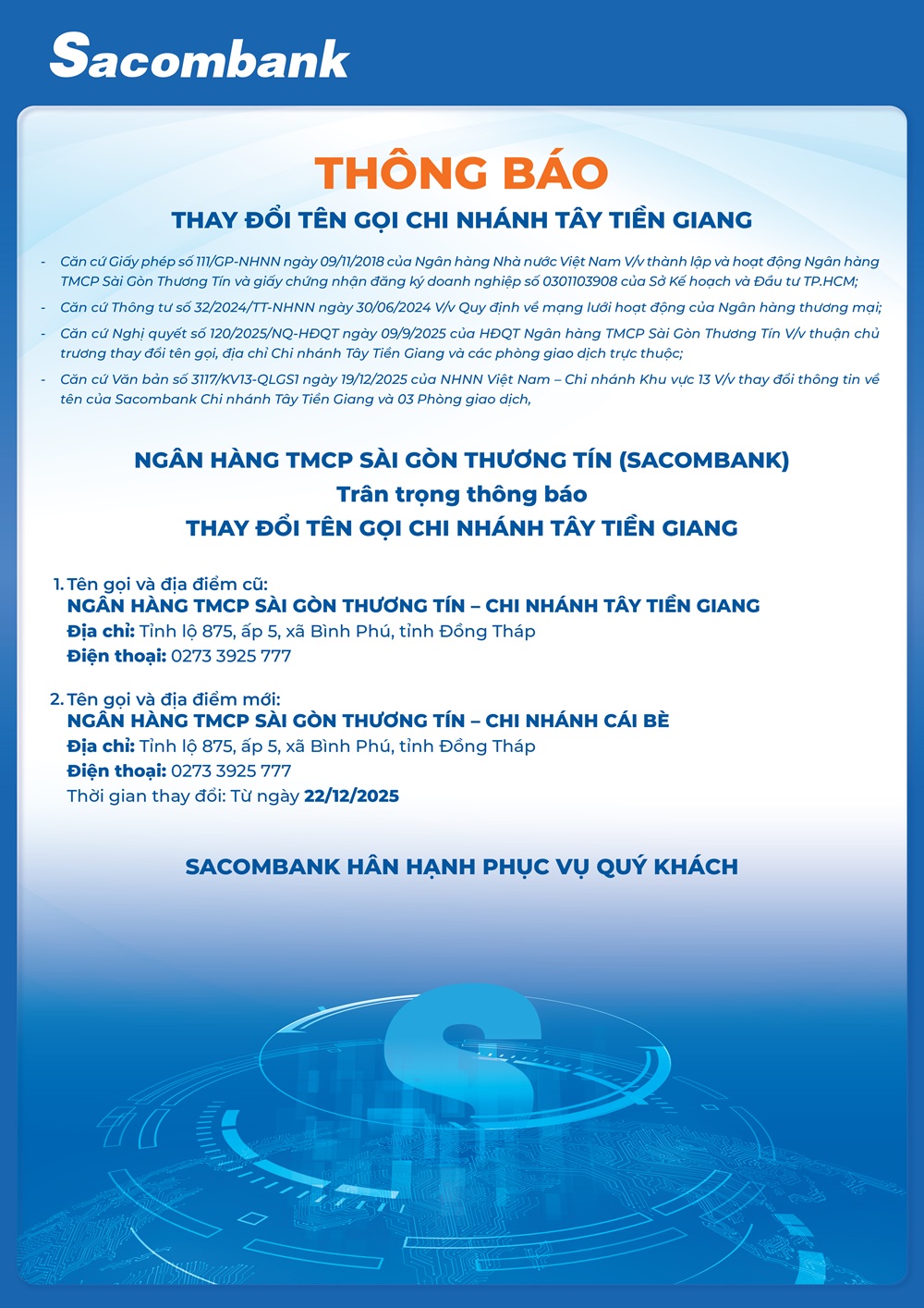 Sacombank trân trọng thông báo đến Quý Khách hàng về việc thay đổi tên gọi Chi nhánh Tây Tiền Giang.
