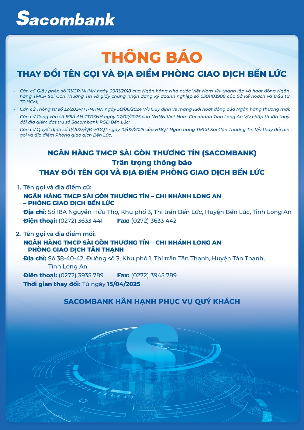Sacombank trân trọng thông báo đến Quý Khách hàng về việc Thay đổi tên gọi, địa điểm PGD Bến Lức.
