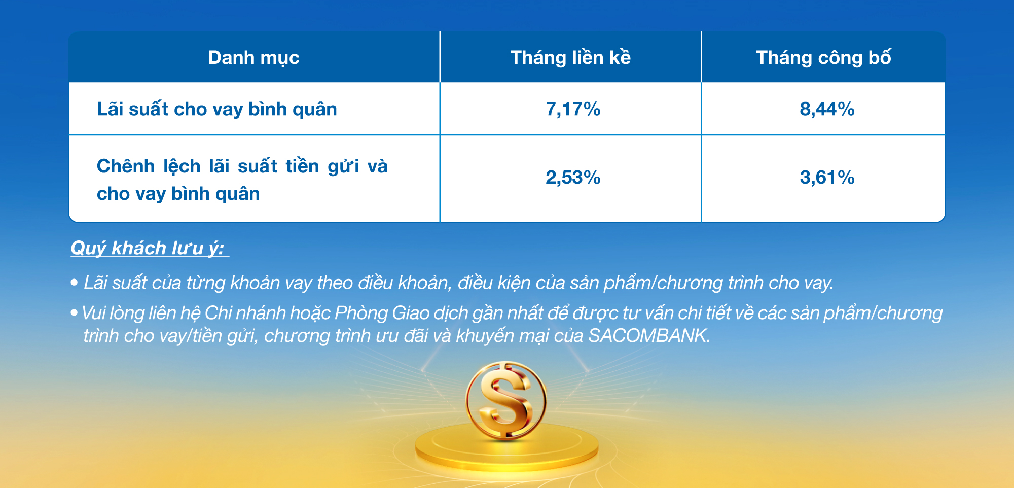SACOMBANK công bố lãi suất bình quân của các khoản vay mới giải ngân trong tháng 12.2025 đối với khách hàng như sau: