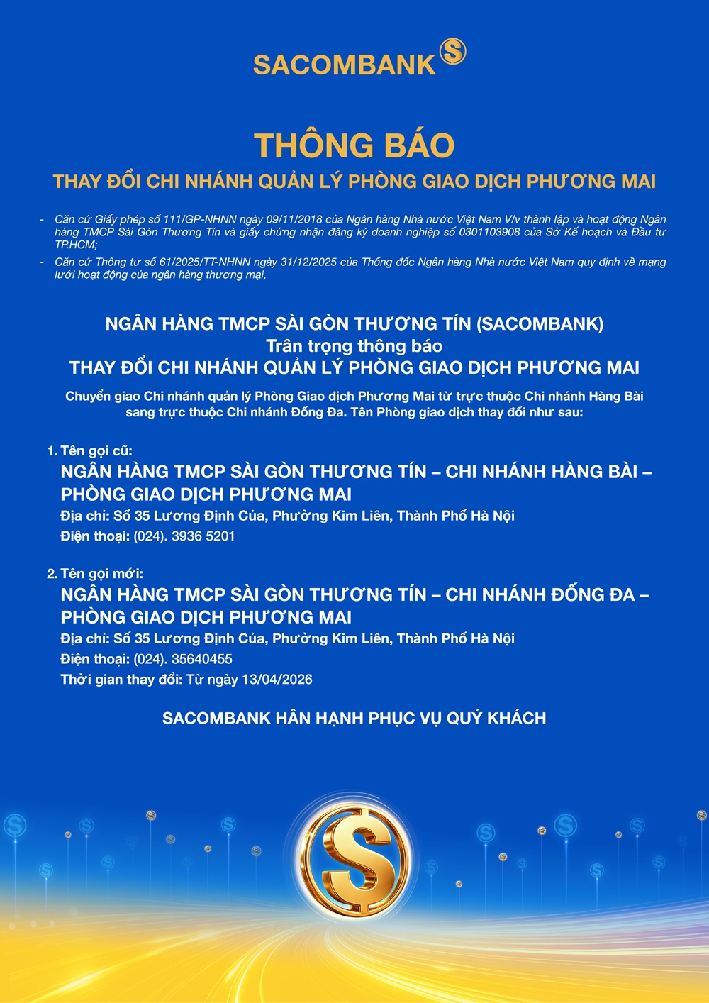 SACOMBANK trân trọng thông báo đến Quý Khách hàng về việc thay đổi Chi nhánh quản lý Phòng giao dịch Phương Mai.
