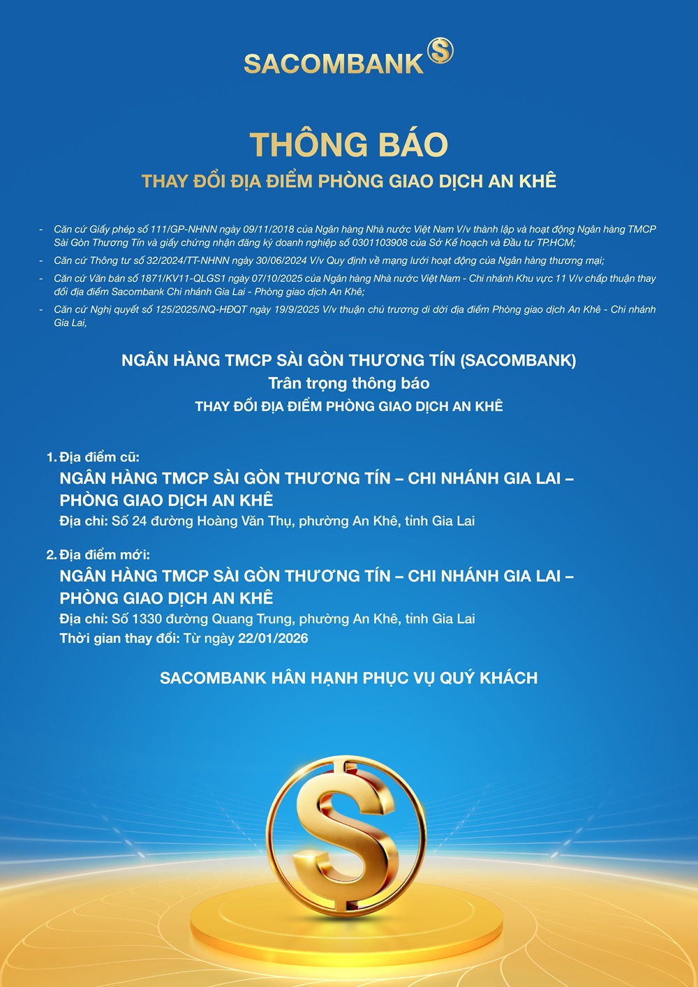 SACOMBANK trân trọng thông báo đến Quý Khách hàng về việc thay đổi tên gọi Phòng giao dịch An Khê.