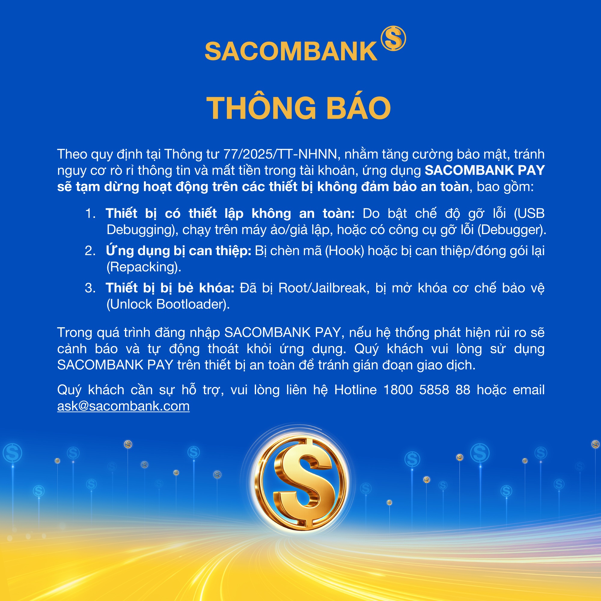 Ứng dụng SACOMBANK PAY tạm dừng hoạt động trên các thiết bị không đảm bảo an toàn